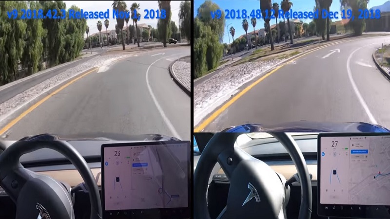 Entre Setembro e Dezembro a Tesla lançou três actualizações, e o dono de um Model 3 mostra como uma curva que na versão 8.1 do Autopilot era “assustadora” de se fazer, com o carro a parecer estar prestes a sair da estrada e obrigando a intervenção humana; passou a ser feita sem grandes dificuldades, inicialmente a uma velocidade mais cautelosa, e de forma ligeiramente mais célere na versão seguinte.