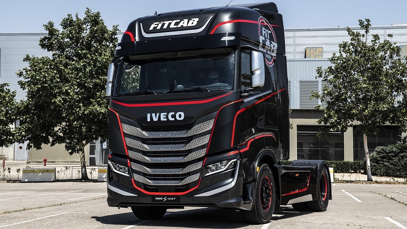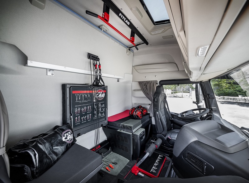 O IVECO FIT CAB eleva ainda mais os padrões do desenvolvimento centrado no motorista, com o objectivo de melhorar o seu bem-estar, conforto e desempenho, e reduzir drasticamente as consequências de longas horas de condução. A decoração desportiva, com um logótipo inspirado nos programas de fitness, assinala as funcionalidades adicionais da cabina como um ginásio sobre rodas, dotada de dispositivos para melhorar a mobilidade, estabilidade, força e aptidão geral do motorista.