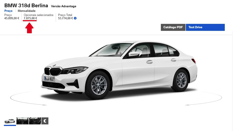 Num BMW 318d, seleccionar o “BMW Live Cockpit Professional” e “Assistente condução Profissional” inflaciona o preço dos opcionais para 7.875 euros – e ainda haveria muitos mais milhares de euros a gastar em extras, como faróis LED (€1.000) ou laser (€2.000), ou assistente de estacionamento (€570) ou acesso sem chave (€620), entre muitos, muitos mais.
