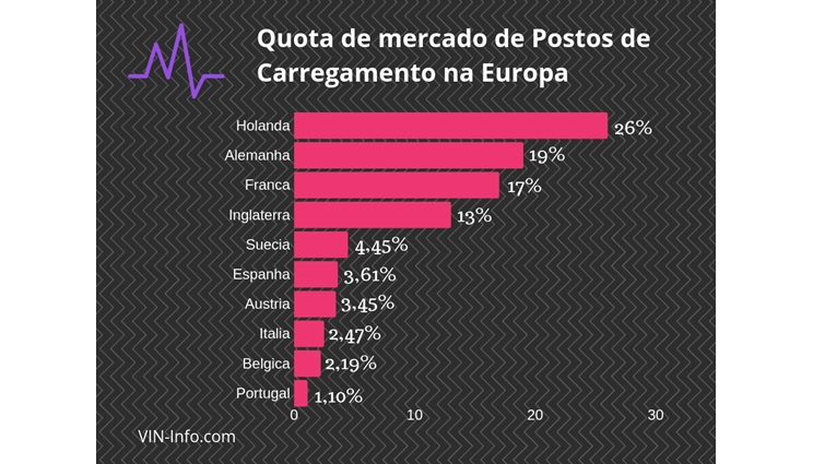 Dos 144.000 postos de carregamento de veículos eléctricos disponíveis na União Europeia, mais de 26% estão na Holanda (37.037), outros 19% na Alemanha (27.459), 17% na França (24.850) e 13% no Reino Unido (19076). Portugal com 1.596 Postos de Carregamento, está em 10º lugar.