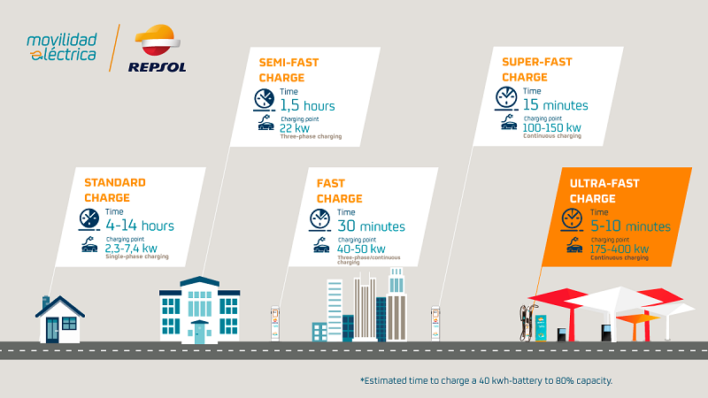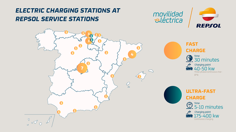 A Repsol possui 36 pontos de carregamento rápido nas suas estações de serviço e participa, através do Ibil, numa rede com mais de 1.700 pontos de carregamento, 230 dos quais acessíveis ao público. A empresa prevê a instalação de novos pontos de carregamento ultra-rápidos nos próximos meses. Em Portugal a empresa possui 4 Postos de Carregamento Eléctrico Rápidos localizados em Estações de Serviço da marca.