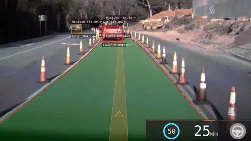 O primeiro caso mostra a capacidade do carro reconhecer cones na estrada, a indicar desvios devido a obras, e correctamente dando prioridade aos cones e ignorando as marcações das linhas na estrada.