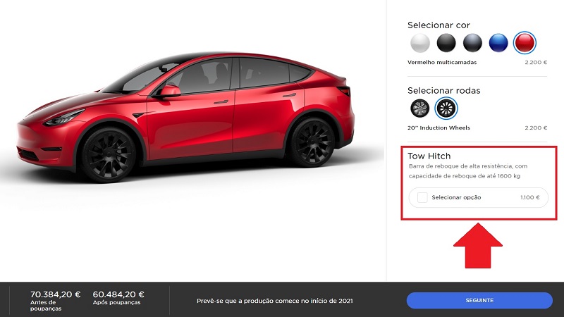 Pois bem, embora no manual a Tesla ainda mantenha a referência de que o Model Y não tem opção para gancho de reboque, no site a opção para o gancho de reboque já aparece disponível (para a Europa e EUA), com um valor de 1.100 euros – o mesmo do Model 3. A diferença é que enquanto no Model 3 a capacidade de reboque é de 910 Kg, no Model Y esse valor aumenta substancialmente para os 1.600 Kg.