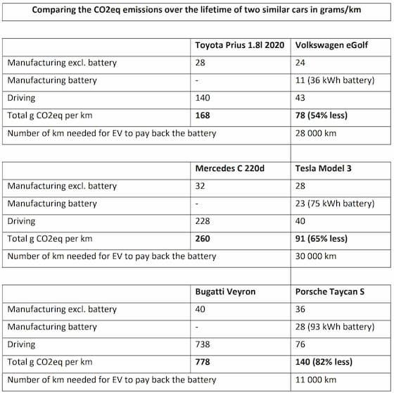 Tendo isso em conta, comparando as emissões de CO2, de carros eléctricos e convencionais, os resultados saltam à vista: um VW eGolf emite 54% menos CO2 ao longo da sua vida útil que um Toyota Prius 1.8l, compensando o custo ecológico da bateria ao fim de 28 mil km; um Tesla Model 3 emite 65% menos CO2 que um Mercedes C 220d, compensando a bateria ao fim de 30 mil km.