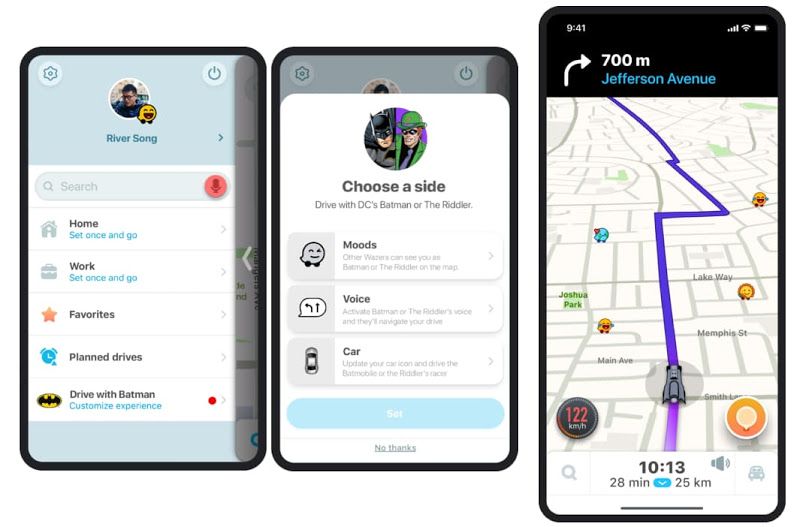 Integrado numa série de eventos e actividades para celebrar o Dia do Batman (19/9/2020), a DC Comics teve a feliz ideia de também o fazer através do Waze. Os utilizadores do Waze verão surgir na app uma opção para conduzirem com o Batman, que irá transformar o seu icon de utilizador, as vozes de navegação, e a representação do carro, que passa a ser um batmobile.