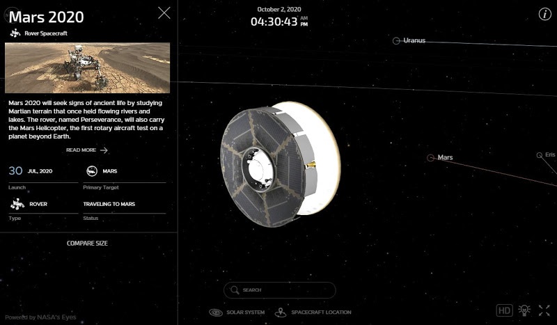 A NASA criou uma página para acompanhar a aventura do Mars 2020 Perseverance, chamada Eyes on the Solar System. Esta página permite uma visualização interactiva do Perseverance, usando exactamente os mesmo dados que são usados pela equipa de navegação da NASA.