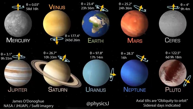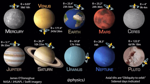 A Terra gira sobre si própria uma vez a cada 23h56m mas, como se poderá imaginar, outros planetas giram a velocidades, e também em ângulos diferentes em relação ao seu plano orbital. Diferenças que são visualizadas na imagem que se segue criada por James O’Donoghue (@PhysicsJ)