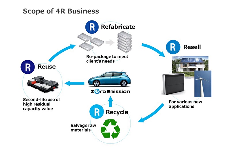 A 4R Energy continua a encontrar novas formas de reformular, reciclar, revender e reutilizar as baterias dos automóveis eléctricos. Em Yumeshima, uma ilha artificial na parte ocidental de Osaka, no Japão, uma central solar está a utilizar 16 baterias de iões de lítio de automóveis eléctricos para fazer face às flutuações de produção de energia.