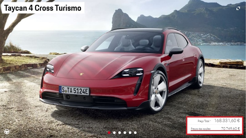 O preço começa nos 97 mil euros para o Taycan Cross Turismo, 116 mil euros para o 4S, 160 mil euros para o Turbo, e 195 mil euros para o Turbo S. Mas claro, estamos a falar da Porsche, e numa rápida simulação com “full extras”, não foi difícil adicionar mais de 70 mil(!) euros de extras ao Taycan Cross Turismo, incluindo coisas como 381 euros para a chave do veículo pintada na cor do carro e 516 euros pelo Porsche Electric Sport Sound.