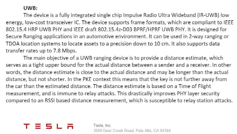 Há várias marcas a trabalharem no uso de smartphones como chaves, e no caso da Tesla isso passa pela utilização do mais recente sistema UWB (Ultra Wideband). Esta tecnologia tem sido usada para permitir a criação de trackers de localização com maior precisão que os trackers Bluetooth, e no caso da Tesla essa vantagem seria utilizada de múltiplas formas. A componente do posicionamento permitiria eliminar os ataques de retransmissão dos sinais wireless da chave; e em sentido inverso, permitiria também uma localização precisa do carro, mesmo em zonas sem GPS (como parques subterrâneos).
