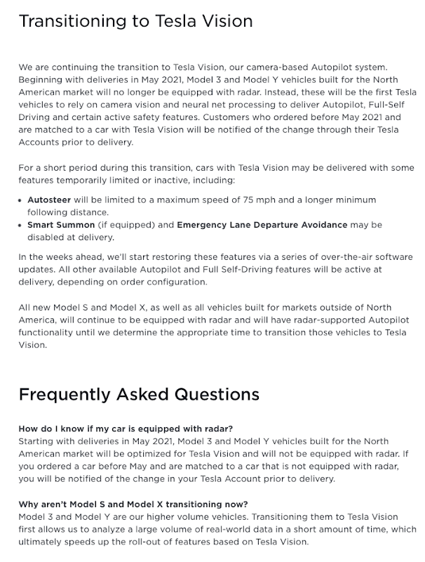 Como em transições anteriores – como quando mudou do sistema de câmaras Mobileye para o seu próprio – há algumas limitações e perda de funcionalidades iniciais, que parecem indicar que esta transição está a ser “acelerada” mesmo antes de estar pronta para entrar em acção. Por agora, a Tesla diz que o sistema Autosteer fica limitado a uma velocidade máxima de 120 km/h, com um aumento da distância mínima de segurança para o carro da frente e que o Smart Summon e aviso de saída da faixa de rodagem também poderão estar desactivados – prometendo a reposição destas funcionalidades durante as próximas semanas, através de actualizações.