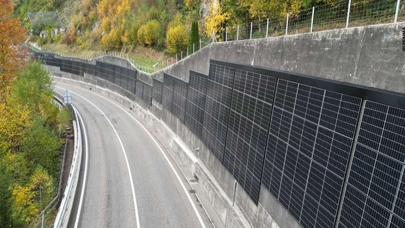 Na Suiça, um programa piloto vai avaliar o desempenho de painéis solares verticais numa parede de retenção numa estrada de montanha.