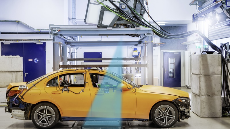 Durante vários anos, a divisão de segurança dos modelos Mercedes-Benz tem investigado a utilização da tecnologia de raio X em testes de colisão, juntamente com os parceiros do EMI. O factor decisivo para o avanço foi a utilização de um acelerador linear com frequência de 1 kHz como fonte de radiação. O dispositivo é de longe muito mais poderoso do que os flashes de raio X anteriormente utilizados nos testes: a energia dos fotões do acelerador linear é de até nove mega eletrão-volt. Isto permite o rastreio de todos os materiais habitualmente utilizados na construção de veículos. A duração do impulso de raio X é de apenas alguns microssegundos. Isto torna possível registar processos de deformação durante o teste de colisão sem a desfocagem do movimento. O acelerador linear também gera um fluxo contínuo de impulsos de raio X. Isto significa que é possível produzir até 1.000 imagens por segundo. Este valor representa cerca de 1.000 vezes os procedimentos convencionais de raio X.