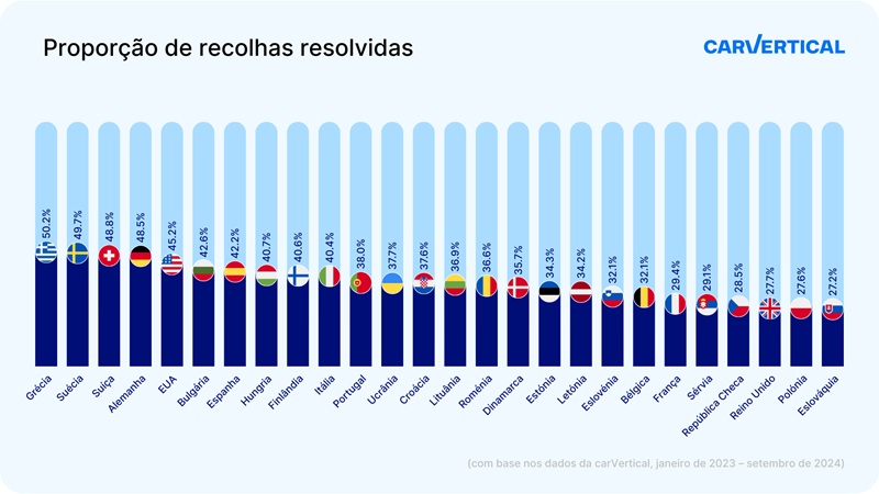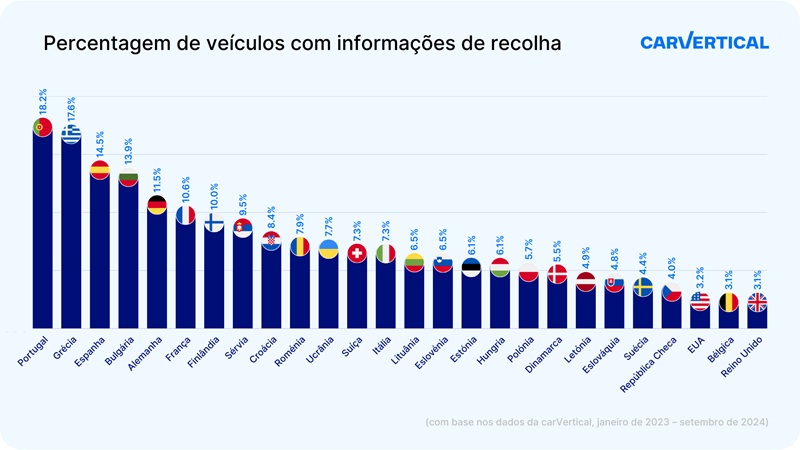 Entre os automóveis verificados pela carVertical em Portugal, 18,2% tinham sido objeto de um processo de recolha pelo menos uma vez. Este valor coloca Portugal em 1.º lugar entre os 26 países incluídos no estudo.