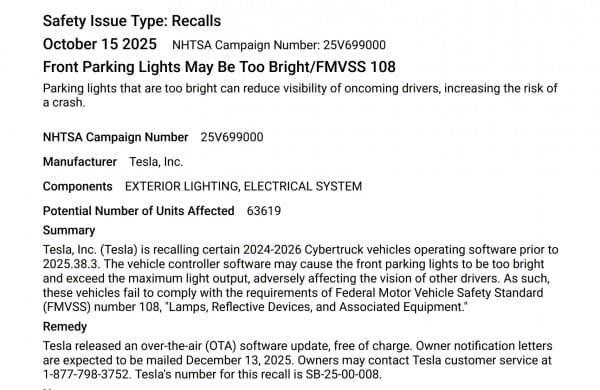 Este recall, como na maioria dos casos, não obriga a uma ida física às oficinas mas sim a uma simples actualização de software, e está relacionado com as luzes de presença dianteiras demasiado brilhantes, ultrapassando o limite máximo permitido. Apesar de ser uma correcção menor, este episódio soma-se à longa lista de recalls do Cybertruck. Só no último ano, o modelo teve sete recalls distintos, incluindo um caso mais grave em que painéis de carroçaria podiam descolar.
