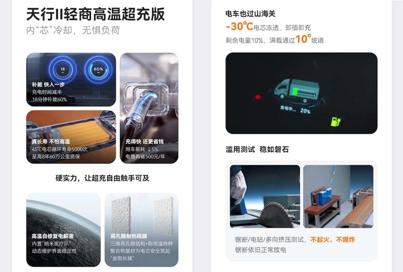 A bateria de iões de sódio usada nos veículos de passageiros tem 45 kWh e oferece até (optimistas) 400 km de autonomia. Segundo a CATL, futuras evoluções permitirão atingir autonomias de 500 a 600 km, à medida que a tecnologia evolui. Com uma densidade energética de até 175 Wh/kg, estas baterias já se aproximam das LFP, o que viabiliza a sua utilização comercial. O desempenho em temperaturas extremas é um dos grandes trunfos. A CATL refere que estas baterias continuam a carregar a -30°C e mantêm cerca de 90% da capacidade mesmo a -40°C, superando as baterias de lítio convencionais. A empresa acrescenta ainda que são mais seguras e menos inflamáveis.