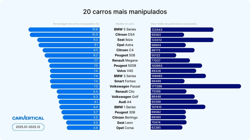 Em 2025, o carro mais frequentemente adulterado em Portugal foi o BMW Série 5, com 10,6% destes modelos verificados na carVertical a apresentarem quilometragem manipulada. Em média, a quilometragem deste modelo foi reduzida em 123.443 km. Na lista de modelos com maior número de adulterações seguem-se o Citroen DS4 (10,4%) e o Seat Ibiza (9,3%). O Citroen DS4 registou uma média de 65.563 km, enquanto a quilometragem do Seat Ibiza teve uma redução de 123.312 km.