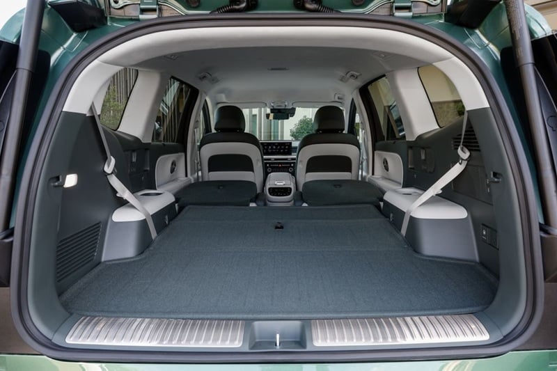 O IONIQ 9 é o maior elétrico da Hyundai até agora (com 5,06 metros de comprimento e 3,13 metros entre eixos) e está pensado para quem precisa de espaço a sério. As três filas de bancos têm altura e espaço para pernas que a marca descreve como comparáveis a uma sala de estar. A bagageira, com a terceira fila rebatida, chega a 908 litros; com todos os lugares ocupados, fica nos 338 litros. Há ainda um frunk de 52 litros na frente, nos modelos AWD.